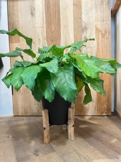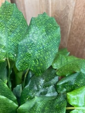 カラテアは熱帯アメリカや熱帯アフリカに分布し、100種類以上の品種があります。ムサイカは、葉柄が個性的な希少種。細かな葉脈が入り、モザイク模様のように見えるオシャレな観葉です。